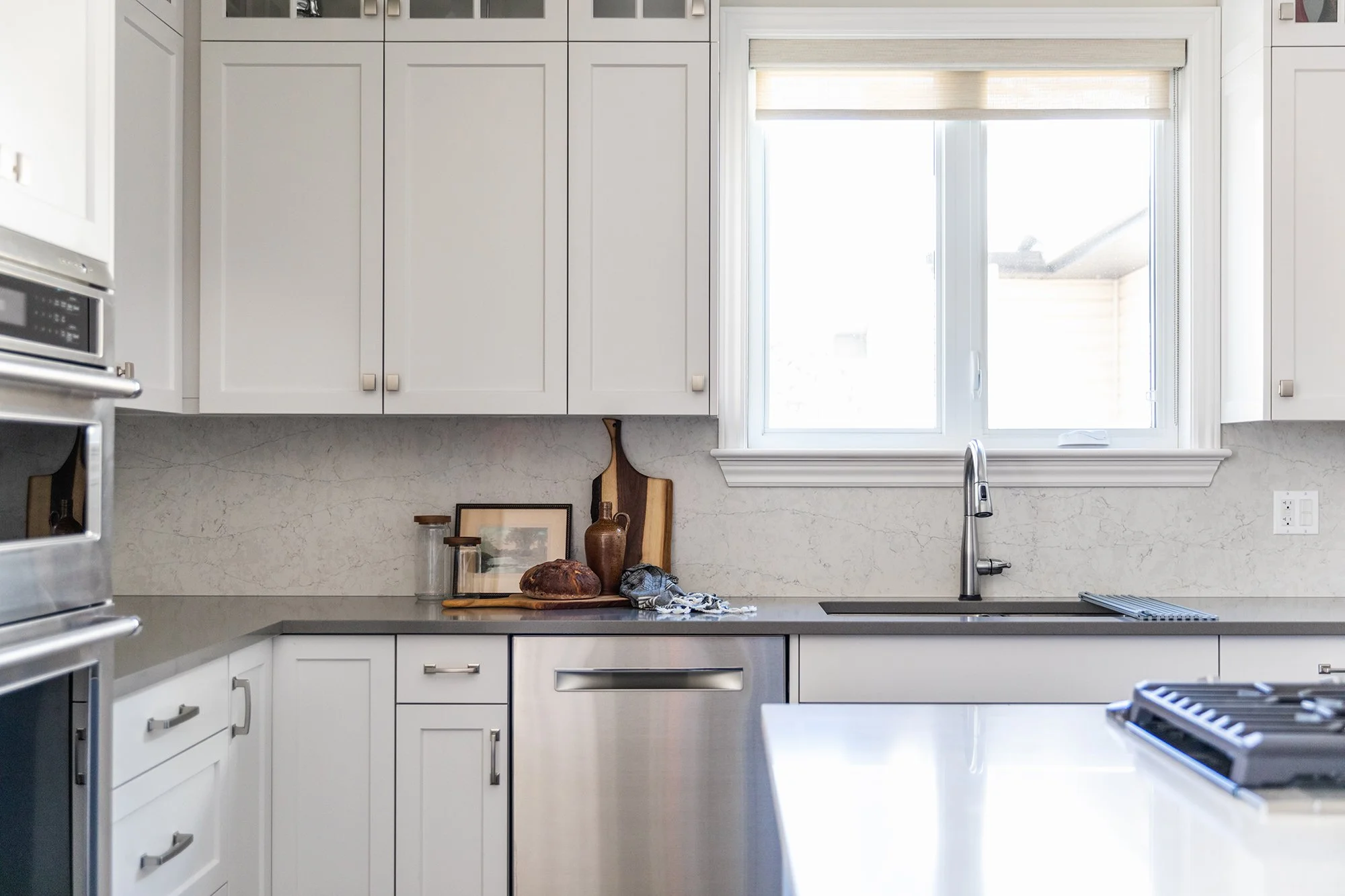 Some clever rearranging, a lighter palette and stacked cabinets to the ceiling reinvent a previously dark and heavy kitchen.